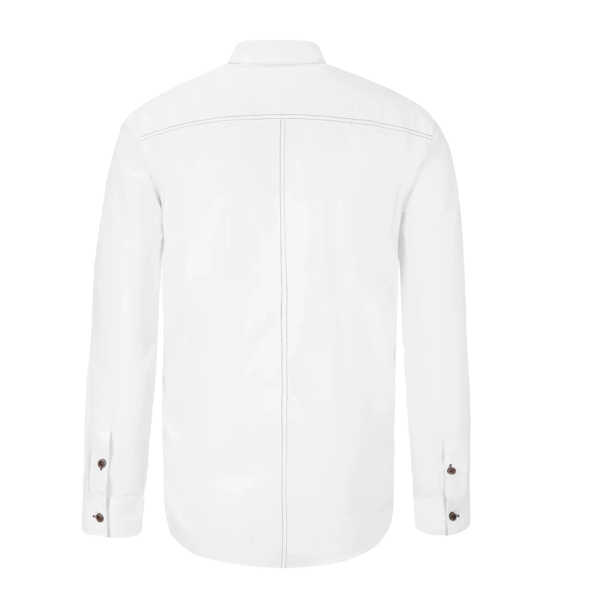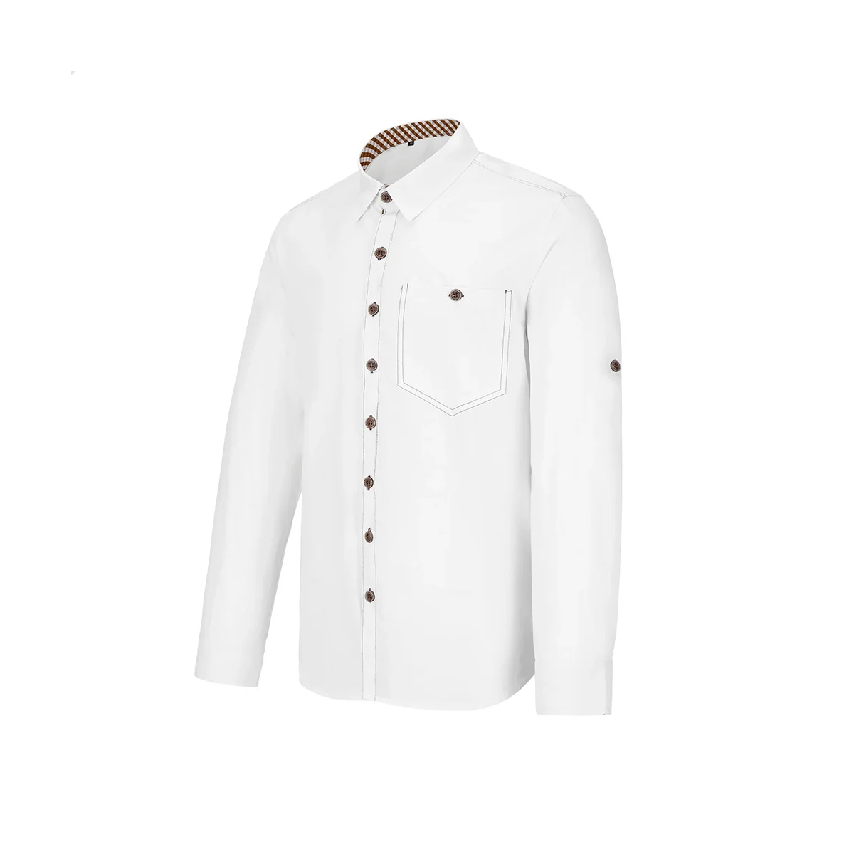 ✔ Design: Premium white shirt with real metal buttons, Brown double stitching, check pattern inside collar and placket, full German charm